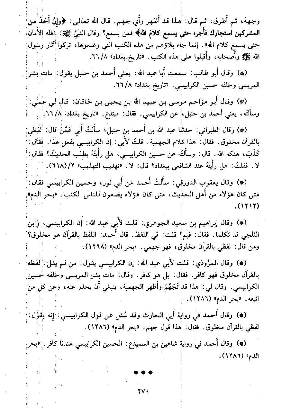 • وقال أبو مزاحم موسى بن عبد الله بن يحيى بن خاقان: قال لي عمي: وسألته، يعني أحمد بن حنبل، عن الكرابيسي. فقال: مبتدع. «تارخ بغداد» 8/66.