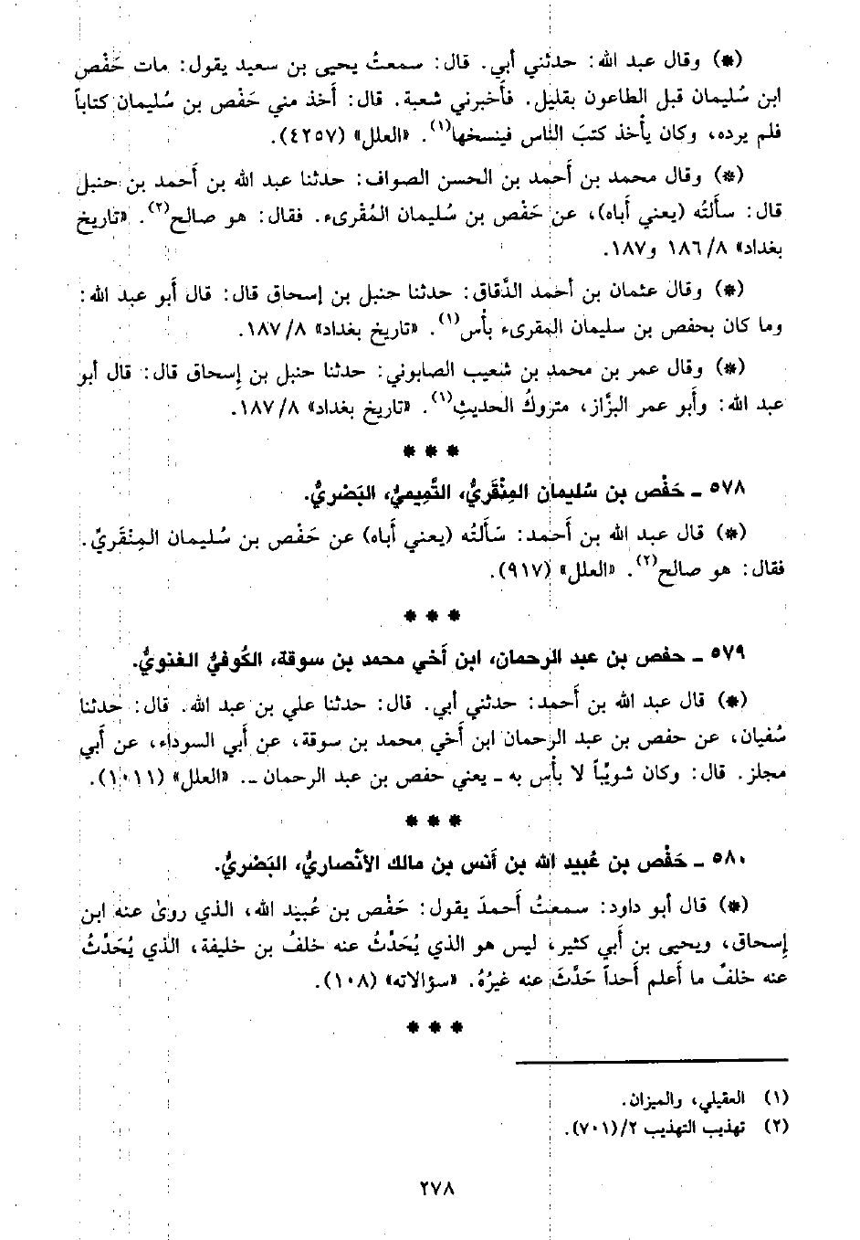 • وقال محمد بن أحمد بن الحسن الصواف: حدثنا عبد الله بن أحمد بن حنبل قال: سألته (يعني أباه) عن حفص بن سليمان المقرىء. فقال: هو صالح. «تاريخ بغداد» 8/186 و187.