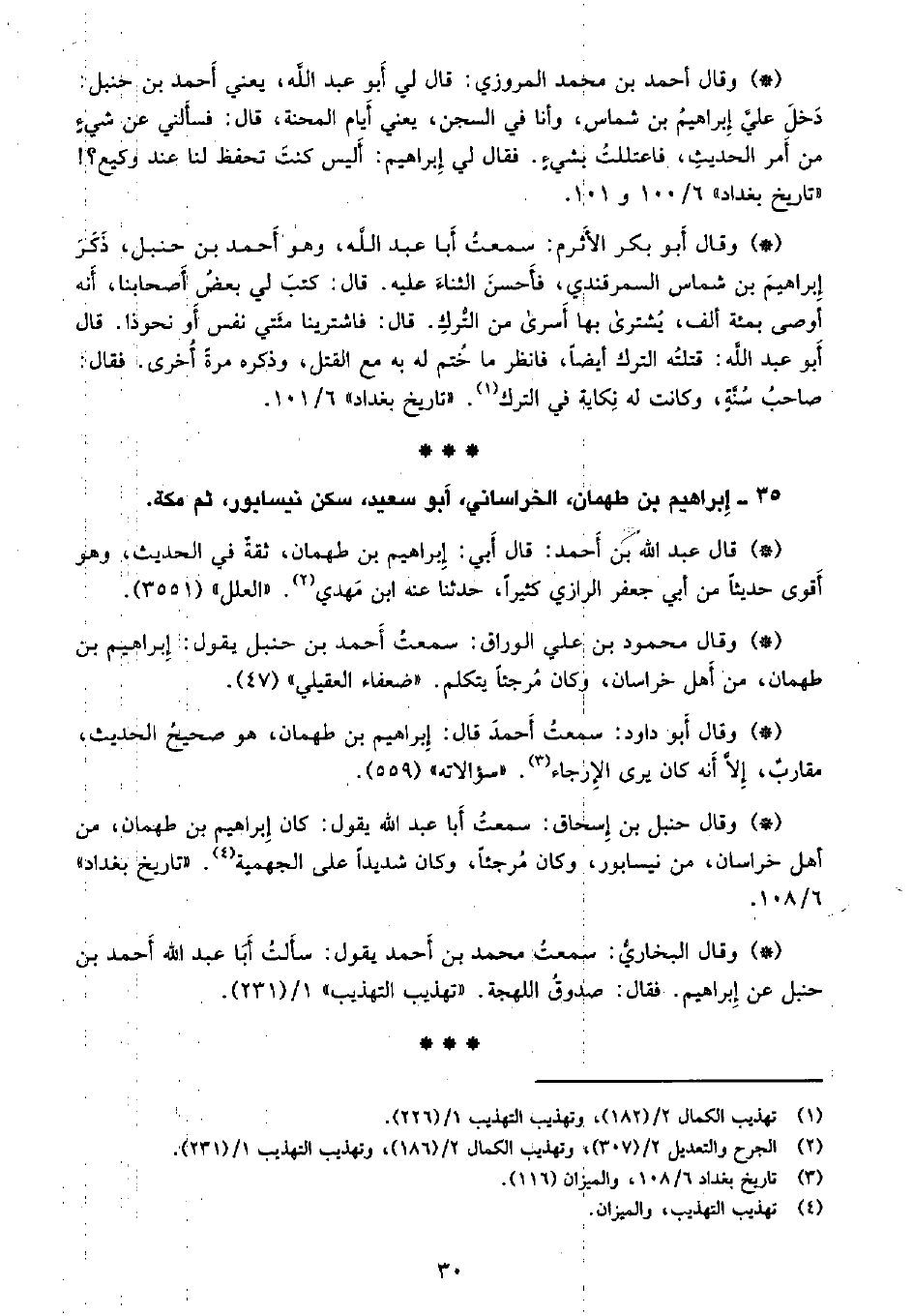 • وقال محمود بن علي الوراق: سمعت أحمد بن حنبل يقول: إبراهيم بن طهمان، من أهل خراسان، وكان مرجئا يتكلم. «ضعفاء العقيلي» (47) .