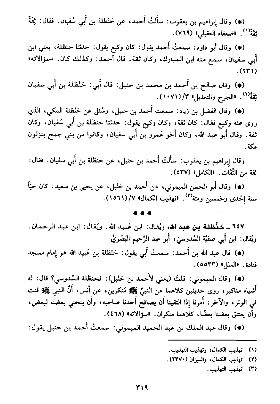 • وقال صالح بن أحمد بن محمد بن حنبل: قال أبي: حنظلة بن أبي سفيان ثقة. «الجرح والتعديل» 3/ (1071) .