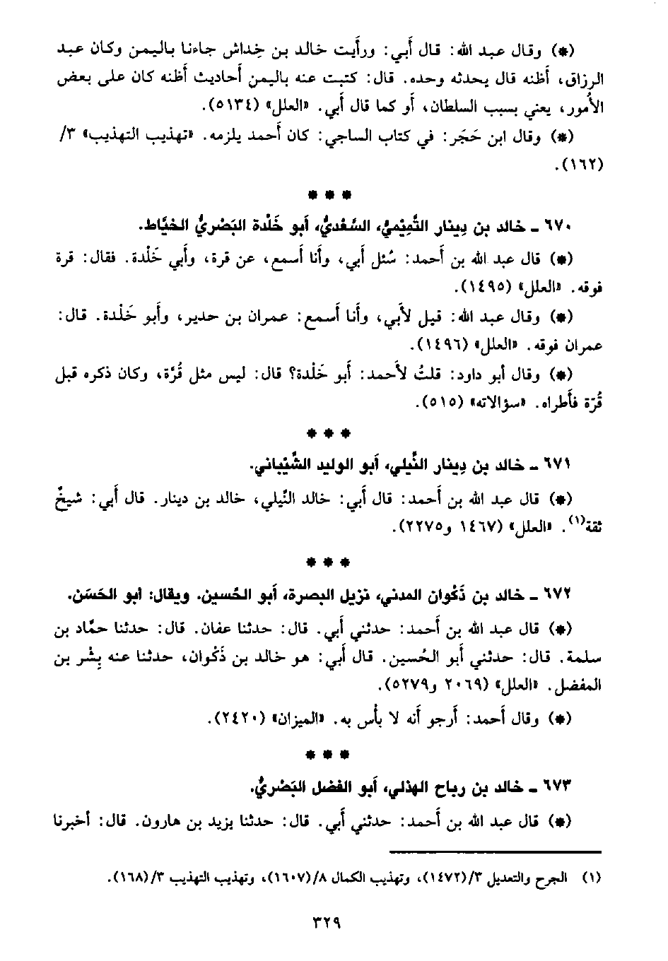 • وقال عبد الله: قال أبي: ورأيت خالد بن خداش جاءنا باليمن وكان عبد الرزاق، أظنه يحدثه وحده. قال: كتبت عنه باليمن أحاديث أظنه كان على بعض الأمور، يعني بسبب السلطان، أو كما قال أبي. «العلل» (5134) .