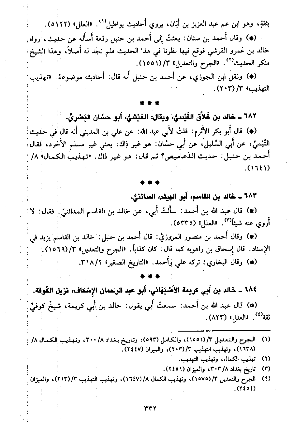 • وقال أحمد بن سنان: بعثت إلى أحمد بن حنبل رقعة أسأله عن حديث، رواه خالد بن عمرو القرشي فوقع فيها نظرنا في هذا الحديث فلم نجد له أصلاً وهذا الشيخ منكر الحديث. «الجرح والتعديل» 3/ (1551) .