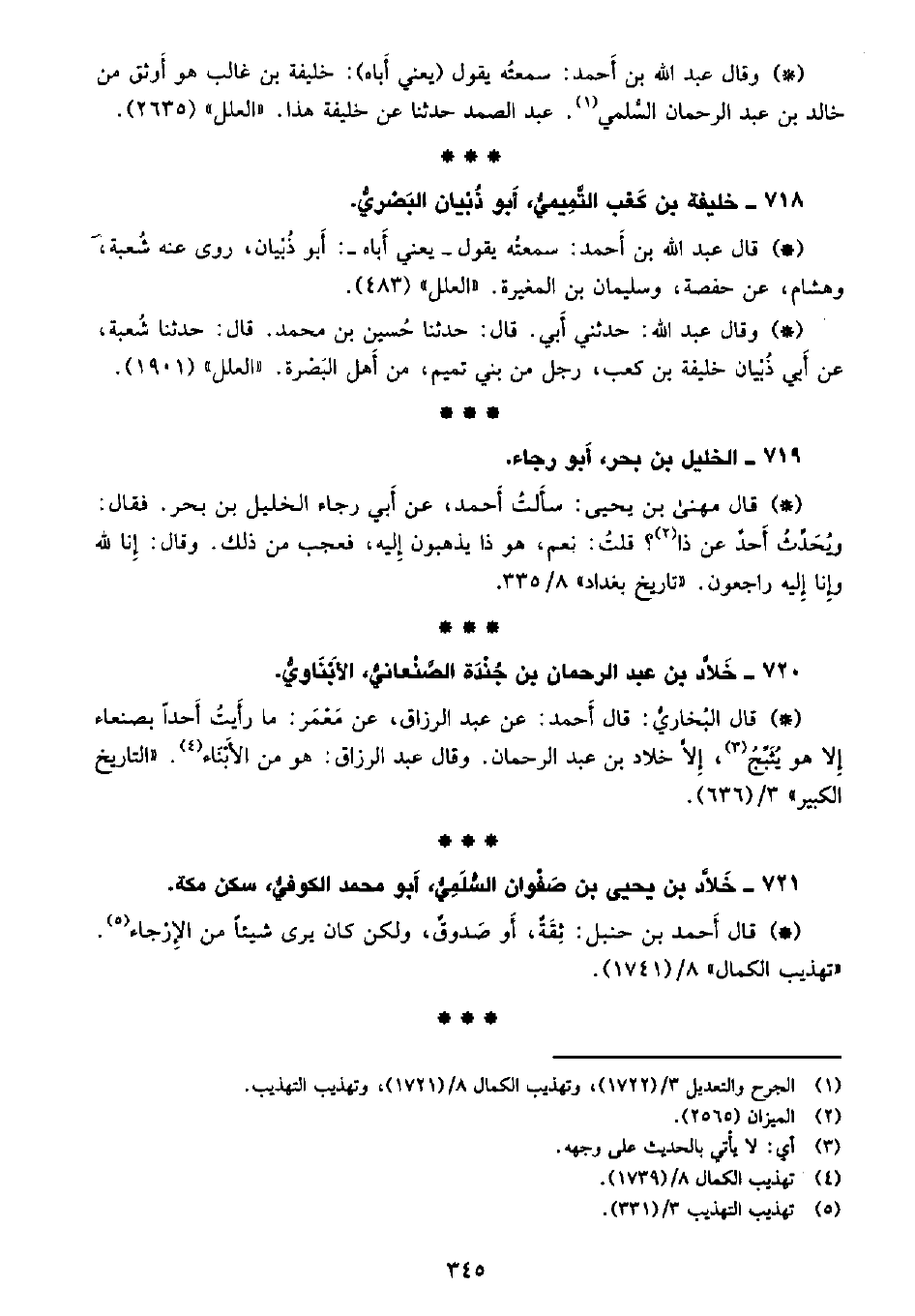 • قال مهنى بن يحيى: سألت أحمد عن أبي رجاء الخليل بن بحر. فقال: ويحدث أحد عن ذا؟ قلت: نعم، هو ذا يذهبون إليه، فعجب من ذلك. وقال: إنا لله وإنا إليه راجعون. «تارخ بغداد» 8/335.