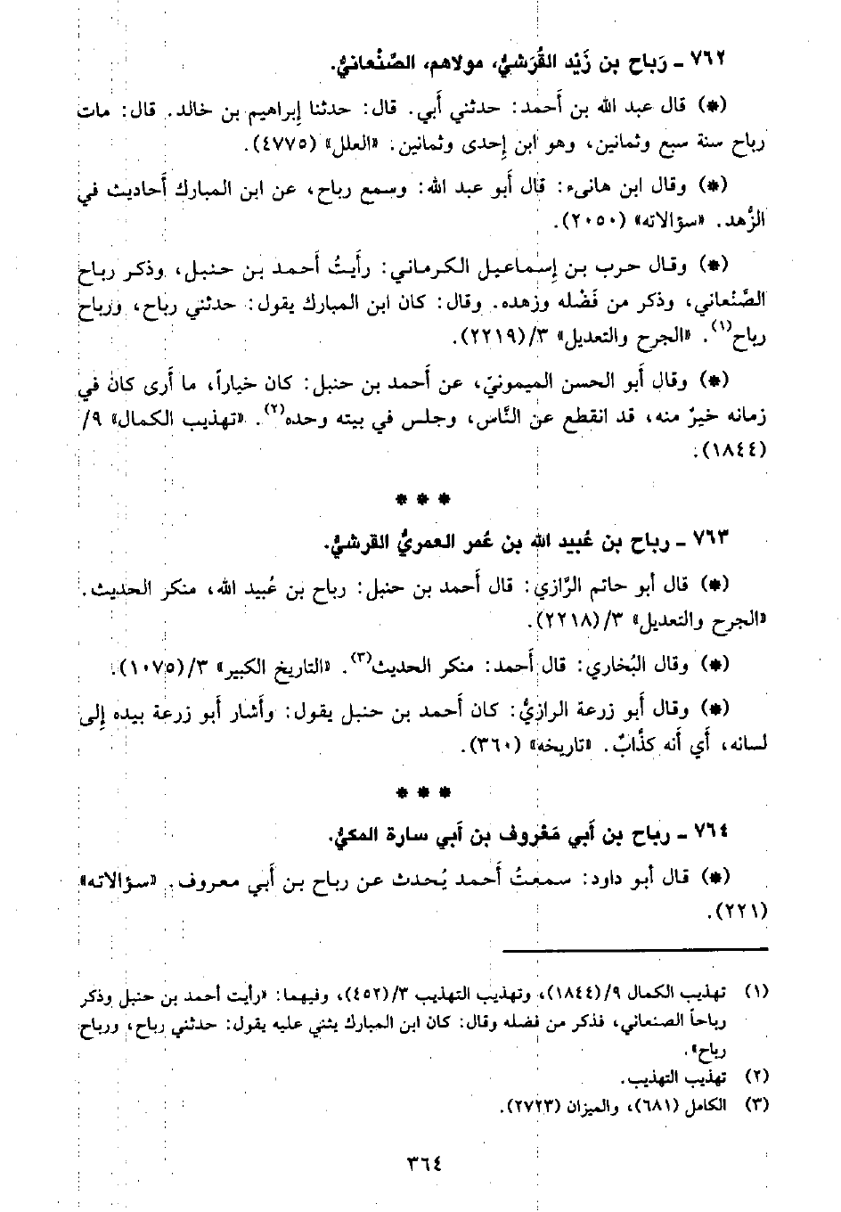 • وقال حرب بن إمماعيل الكرماني: رأيت أحمد بن حبل، وذكر رباح الصنعاني، وذكر من فضله وزهده. وقال: كان ابن المبارك يقول: حدثني رباح، ورباح رباح. «الجرح والتعديل» 3/ (1119) .