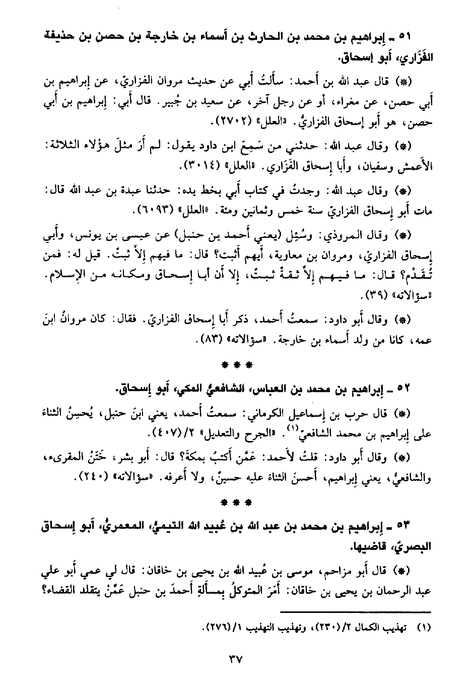 • وقال أبو داود: قلت لأحمد: عمن أكتب بمكة؟ قال: أبو بشر ختن المقرىء، والشافعي، يعني إبراهيم، أحسن الثناء عليه حسين، ولا أعرفه. «سؤالاته» (240) .