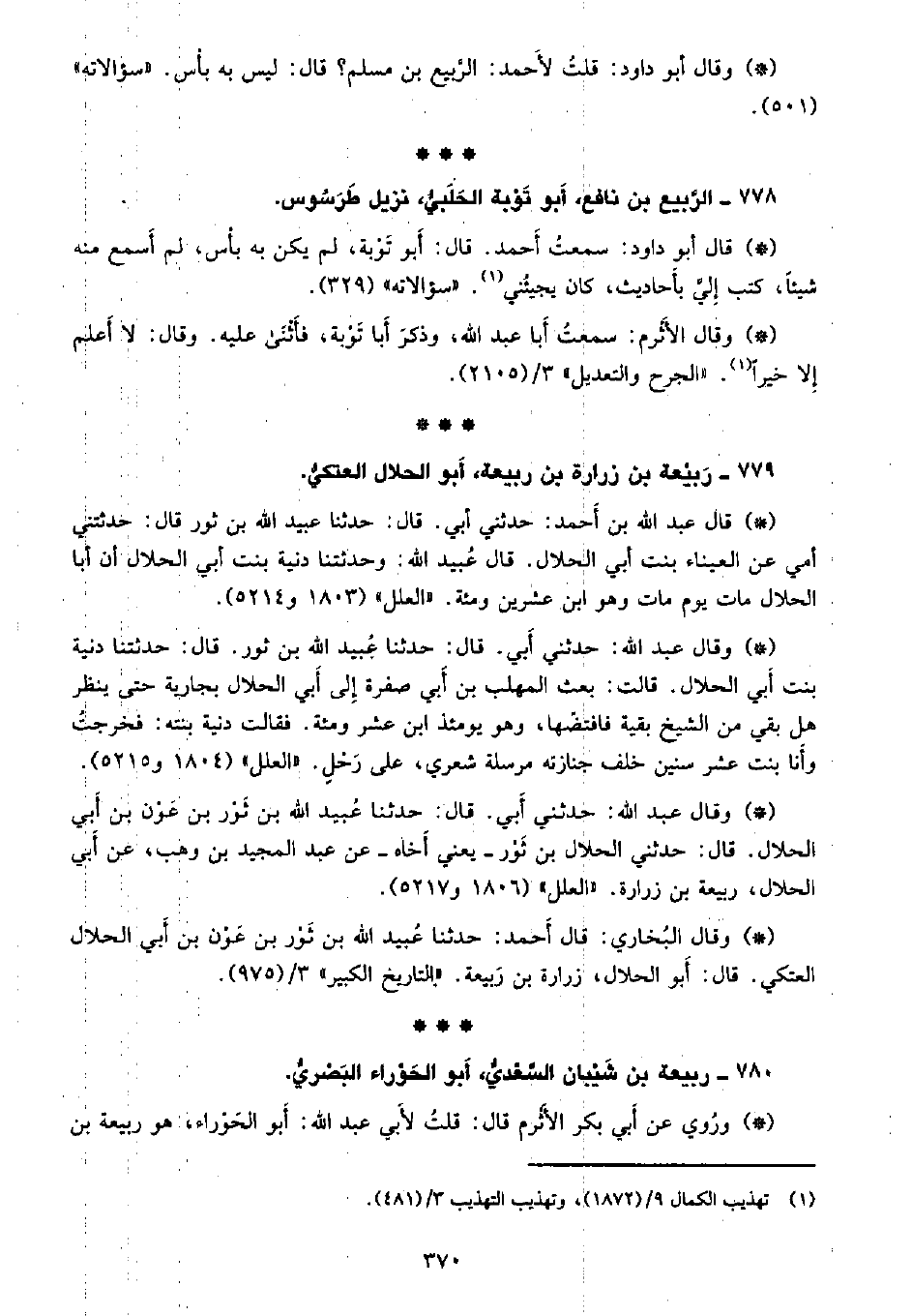 • وقال عبد الله: حدئني أبي. قال: حدثنا عبيد الله بن ثور بن عون بن أبي الحلال. قال: حدثني الحلال بن ثور - يعني أخاه - عن عبد المجيد بن وهب، عن أبي الحلال، ربيعة بن زرارة. «العلل» (1806 و5217) .