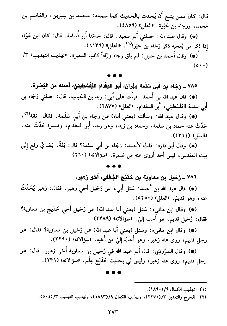 • وقال عبد الله: حدثني أبو سعيد. قال: حدثنا أبو أسامة. قال: كان ابن عون إذا ذكر من يعجبه ذكر رجاء بن حيوة. «العلل» (6139) .