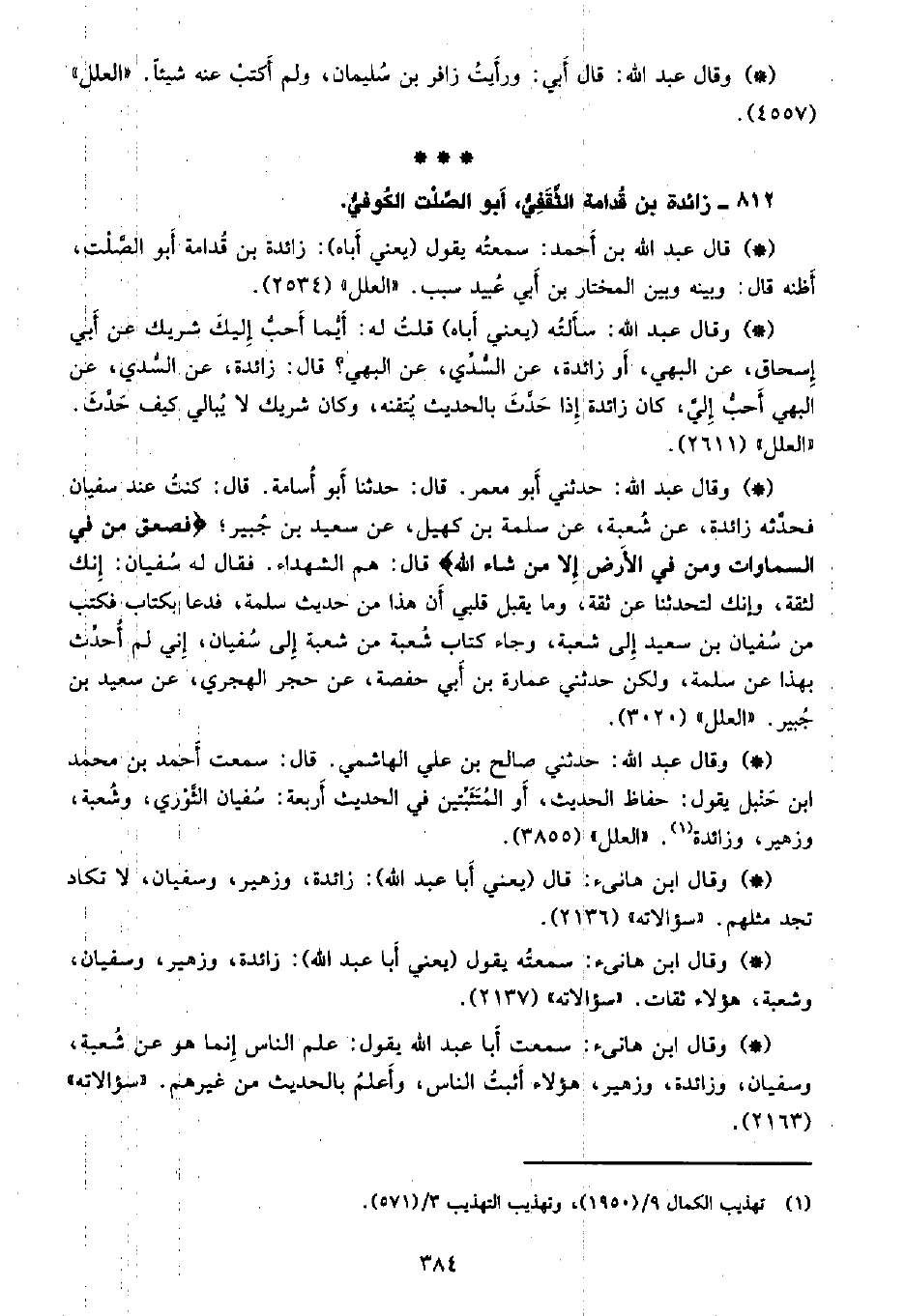 • وقال ابن هانىء: قال (يعني أبا عبد الله) : زائدة، وزهير، وسفيان، لا تكاد تجد مثلهم. «سؤالاته» (2136) .