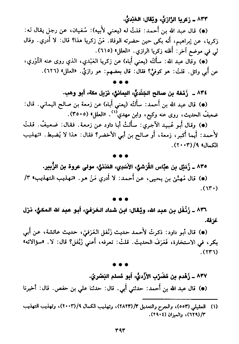 • وقال عبد الله: سألته (يعني أباه) عن زكريا العبدي، الذي روى عنه الثوري، عن أبى وائل. قلت: هو كوفي؟ فقال: قال بعضهم: هو رازي. «العلل» (626) .