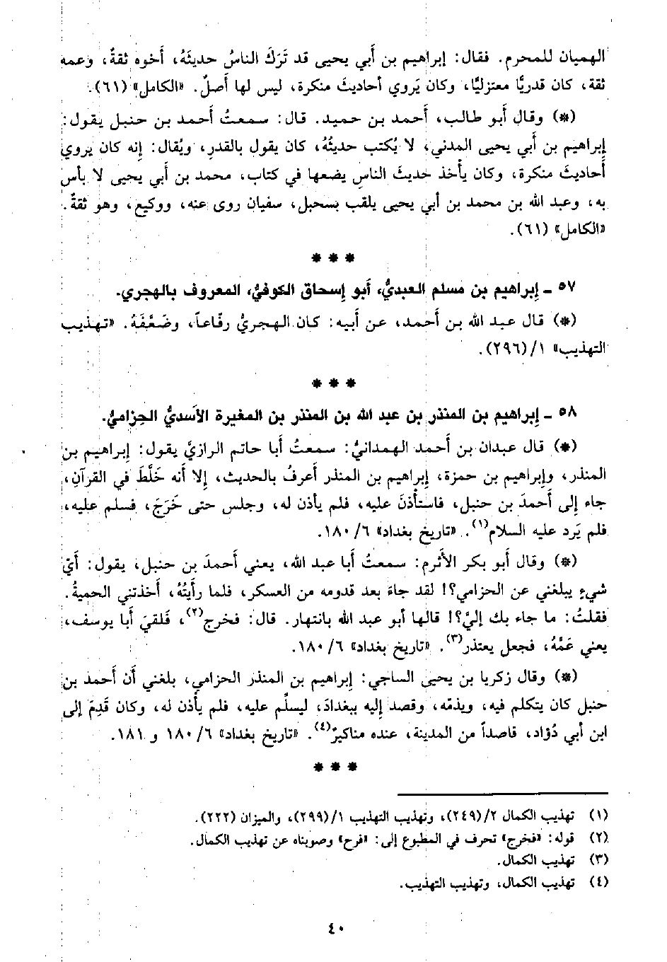 الهميان للمحرم. فقال: إبراهيم بن أبي يحيى قد ترك الناس حديثه، أخوه ثقة، وعمه ثقة، كان قدريا معتزليًا، وكان يروي أحاديث منكرة، ليس لها أصل. «الكامل» (61) .