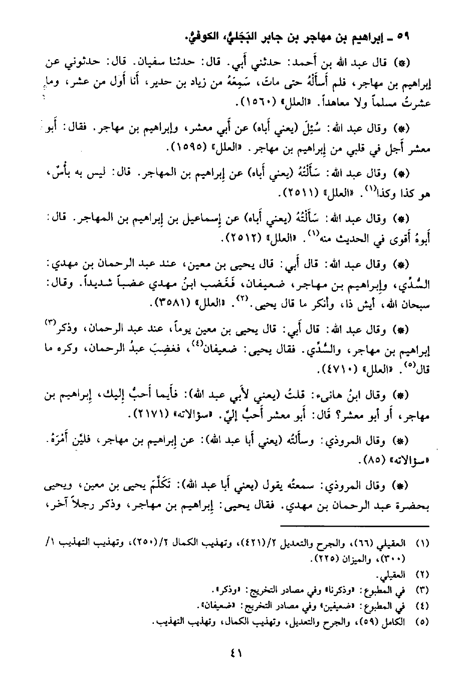 • وقال المروذي: سَمِعتُهُ يقول (يعني أبا عبد الله) : تكلم يحيى بن معين، ويحيى بحضرة عبد الرحمن بن مهدي. فقال يحيى: إبراهيم بن مهاجر، وذكر رجلاً آخر،