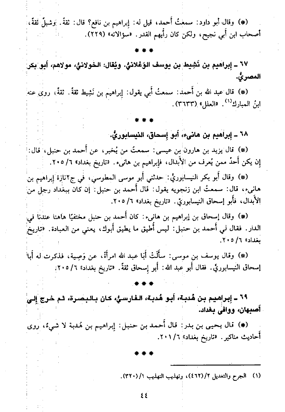 • قال يزيد بن هارون بن عيسى: سمعت من يخبر، عن أحمد بن حنبل، قال: إن يكن أحد ممن يعرف من الأبدال، فإبراهيم بن هانىء. «تاريخ بغداد» 6/205.
