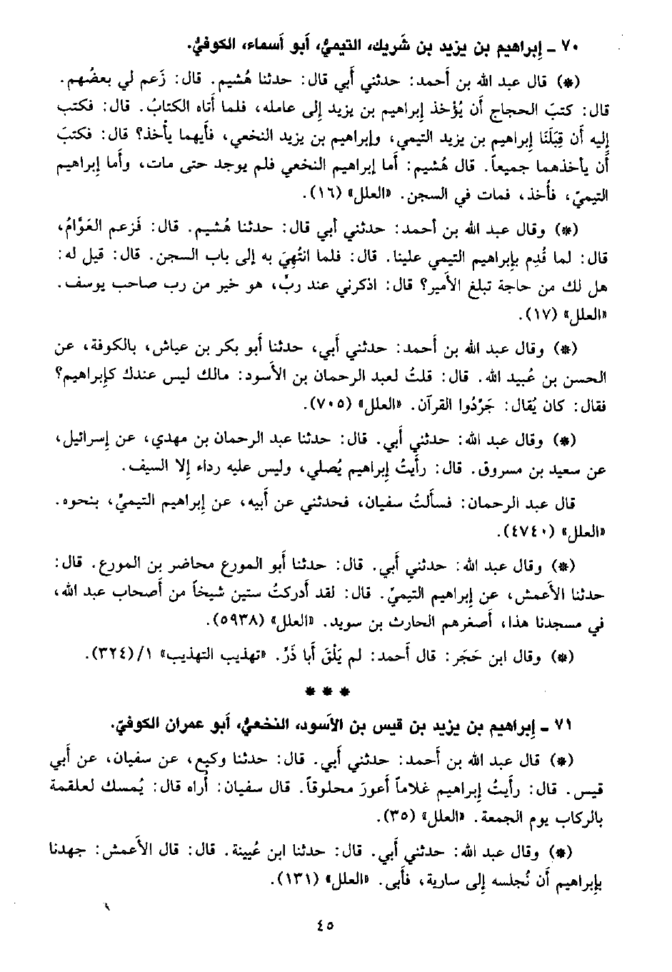 • وقال عبد الله: حدثني أبي. قال: حدثنا ابن عيينة. قال: قال الأعمش: جهدنا بإبراهيم أن نجلسه إلى سارية، فأبى. «العلل» (131) .