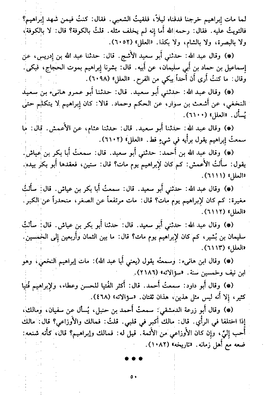 • وقال ابن هانىء: وسَمِعتُهُ يقول (يعني أبا عبد الله) : مات إبراهيم النخعي، وهو ابن نيف وخمسين سنة. «سؤالاته» (2186) .