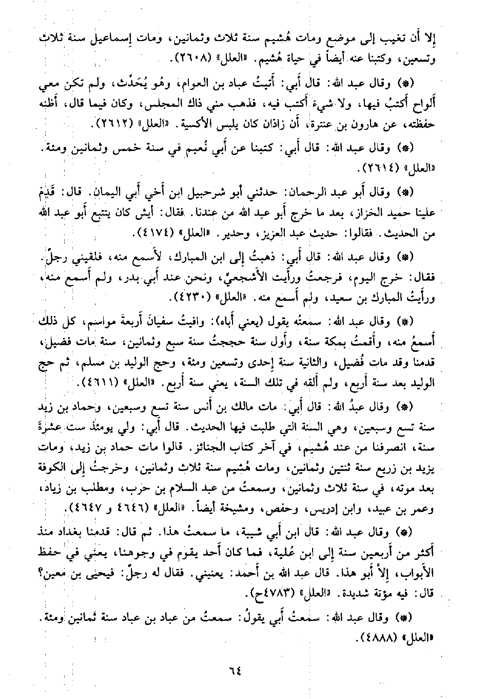• وقال عبد الله: قال أبي: مات مالك بن أنس سنة تسع وسبعن، وحماد بن زيد سنة تسع وسبعين، وهي السنة التي طلبت فيها الحديث. قال أبي: ولي يومئذ ست عشرة سنة، انصرفنا من عند هشيم، في آخر كتاب الجنائز. قالوا مات حماد بن زيد، ومات يزيد بن زريع سنة ثنتين وثمانين، ومات هشيم سنة ثلاث وثمانين، وخرجت إلى الكوفة بعل موته، في سنة ثلاث وثمانين، وسمعت من عبد السلام بن حرب، ومطلب بن زياد، وعمر بن عبيد، وابن إدريس، وحفص، ومشيخة أيضا. «العلل» (4646 و4647) .