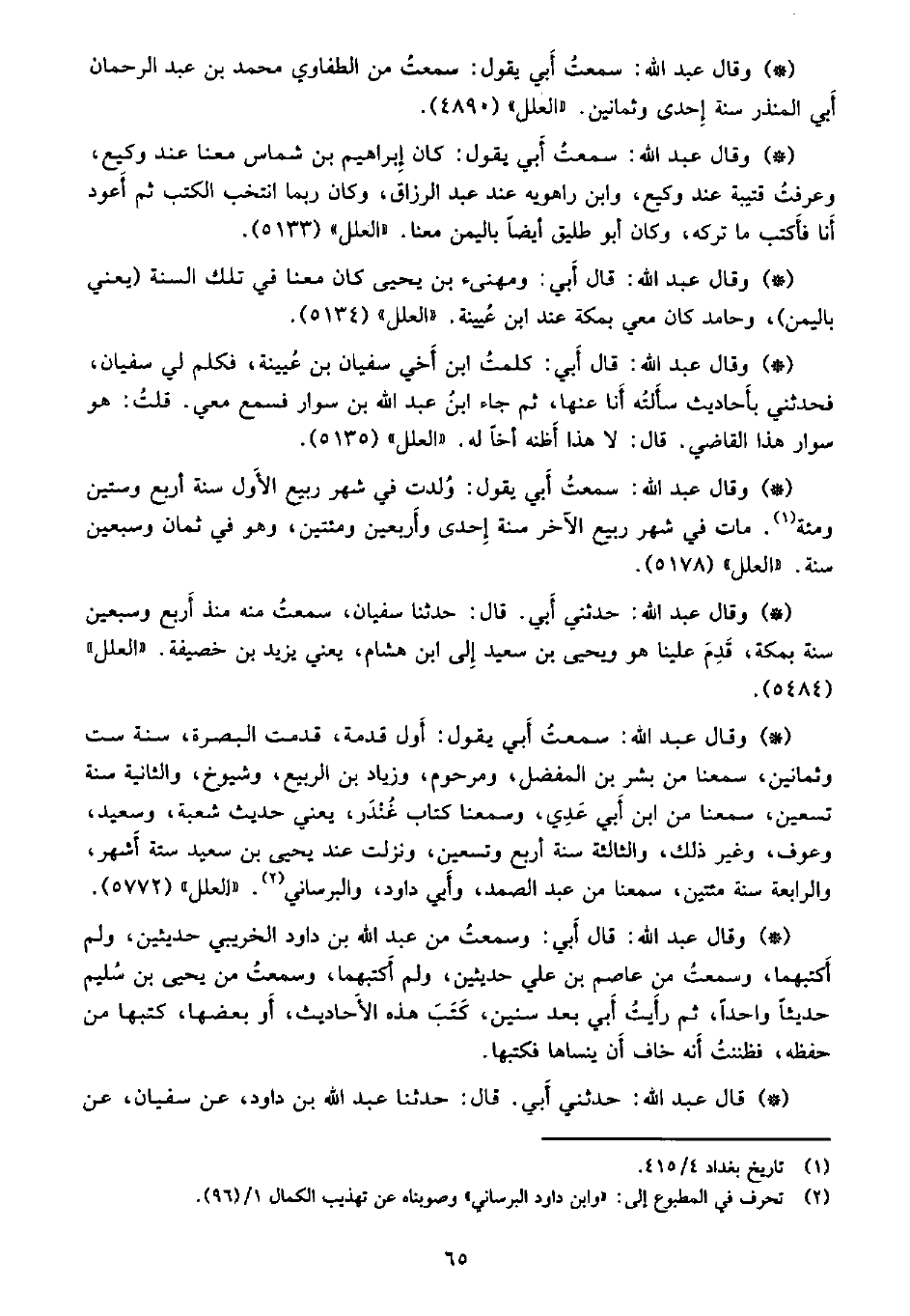 • وقال عبد الله: سمعتُ أَبي يقول: سمعت من الطفاوي محمد بن عبد الرحمن أبي المنذر سنة إحدى وثمانين. «العلل» (4890) .