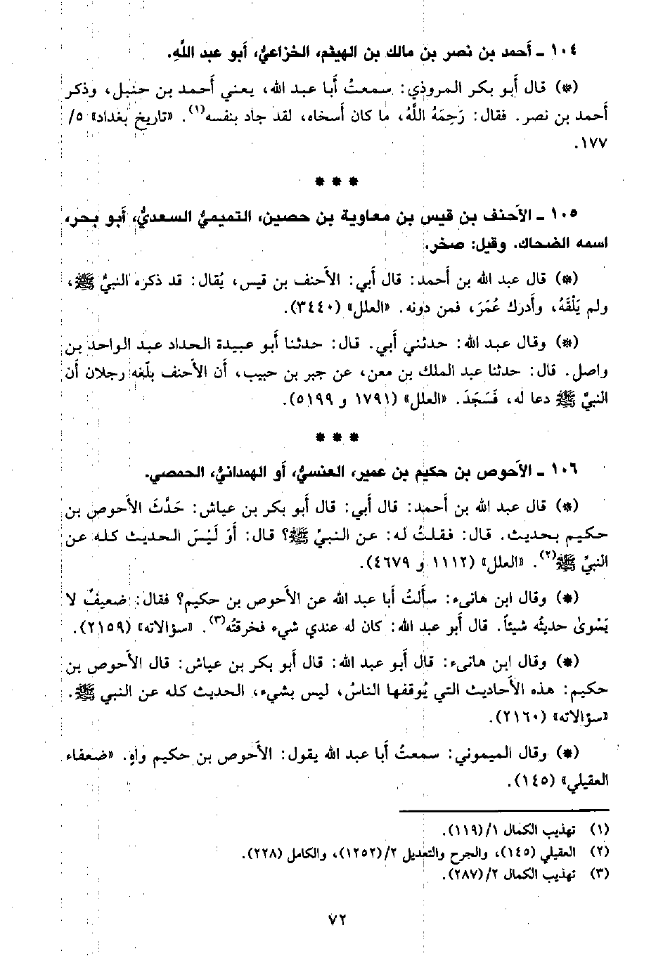 • وقال ابن هانىء: قال أبو عبد الله: قال أبو بكر بن عياش: قال الأحوص بن حكيم: هذه الأحاديث التي يوقفها الناس، ليس بشيء، الحديث كله عن النبي - صلى الله عليه وسلم -. «سؤالاته» (2160) .