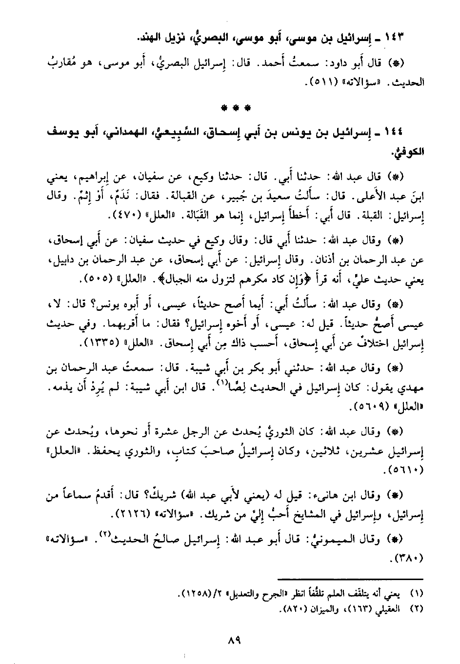 • وقال عبد الله: حدثني أبو بكر بن أبي شيبة قال: سمعت عبد الرحمن بن مهدي يقول: كان إسرائيل في الحديث لصًا. قال ابن أبي شيبة: لم يرد أن يذمه. «العلل» . (5609) .
