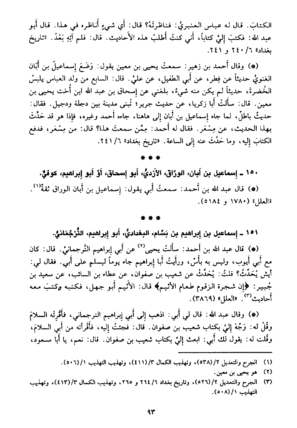 • وقال عبد الله: قال لي أبي: اذهب إلى أبي إبراهيم الترجماني، فأَقرئه السلام وقل له: وجِّه إلي بكتاب شعيب بن صفوان. قال: فجئت إليه، فأقرأته من أبي السلام، وقلت له: قال لك أبي: ابعث إلي بكتاب شعيب بن صفوان. قال: نعم، يا أبا مسعود