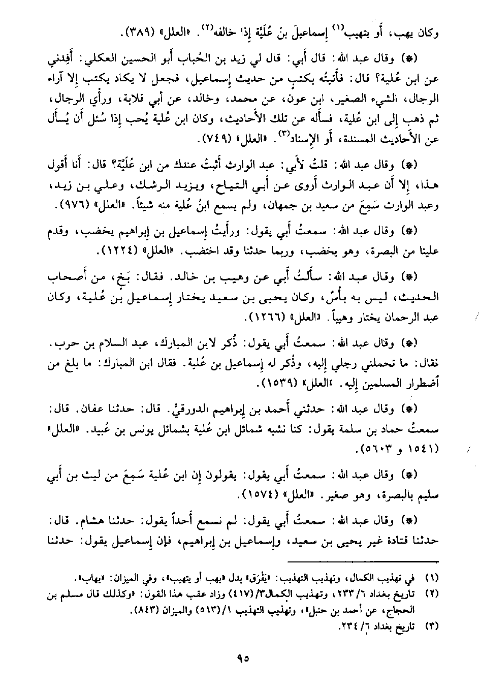 • وقال عبد الله: قال أبي: قال لي زيد بن الحباب أبو الحسين العكلي: أفدني عن ابن علية؟ قال: فأتيته بكتب من حديث إسماعيل، فجعل لا يكاد يكتب إلا أراء الرجال، الشيء الصغير، ابن عون، عن محمد، وخالد، عن أبي قلابه ورأي الرجال، ثم ذهب إلى ابن علية، فسأله عن تلك الأحاديث، وكان ابن علية يحب إذا سئل أن يسأل عن الأحاديث المسندة أو الإسناد. «العلل» (749) .