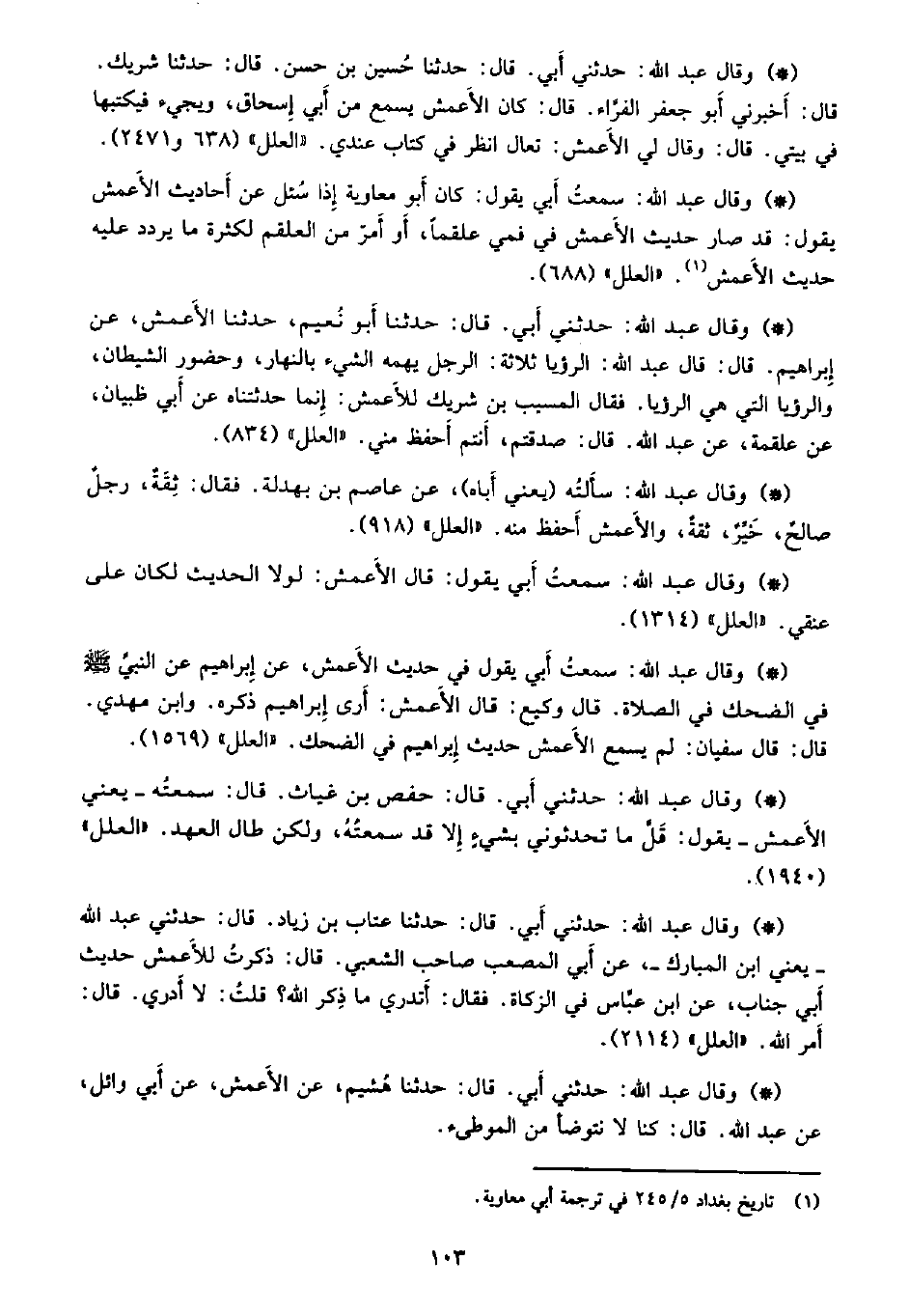 • وقال عبد الله: حدثني أبي. قال: حدثنا حسين بن حسن. قال: حدثنا شريك. قال: أخبرني أبو جعفر الفراء. قال: كان الأعمش سمع من أبي إسحاق، ويجيء فيكتبها في بيتي. قال: وقال لي الأعمش: تعال انظر في كتاب عندي. «العلل» (638 و2471) .