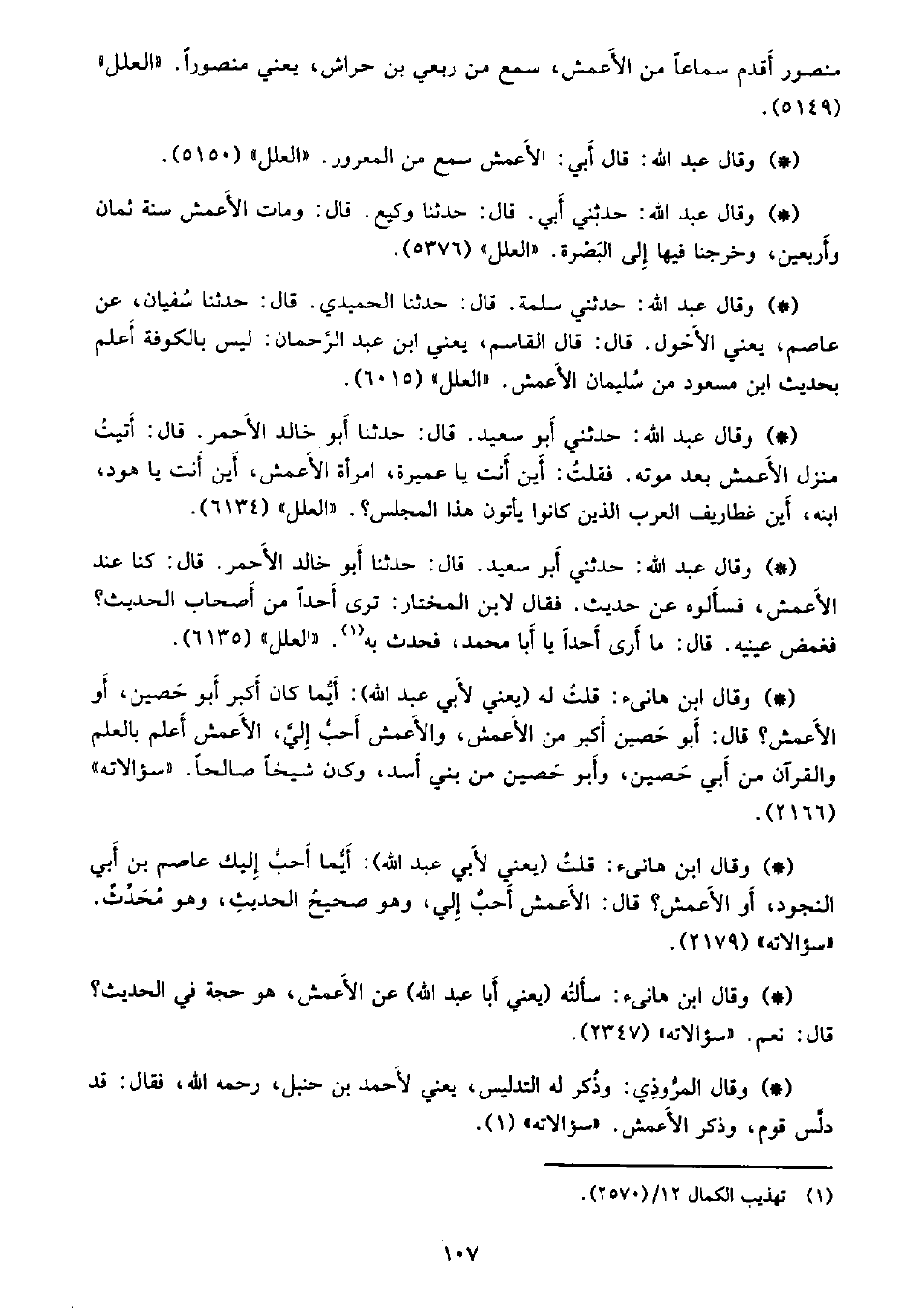 • وقال عبد الله: حدثني أبو سعيد. قال: حدثنا أبو خالد الأحمر. قال: أتيت منزل الأعمش بعد موته. فقلت: أين أنت يا عميرة، امرأة الأعمش، أين أنت يا هود، ابنه، أين غطاريف العرب الذين كانوا يأتون هذا المجلس؟. «العلل» (6134) .