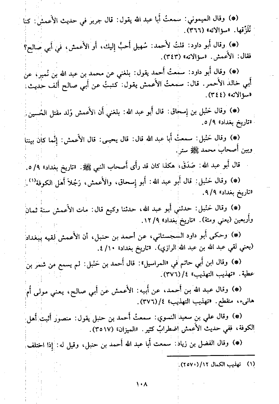 • وقال حنبل: سمعت أبا عبد الله قال: قال يحيى: قال الأعمش: إنما كان بيننا وبين أصحاب محمد - صلى الله عليه وسلم - ستر.