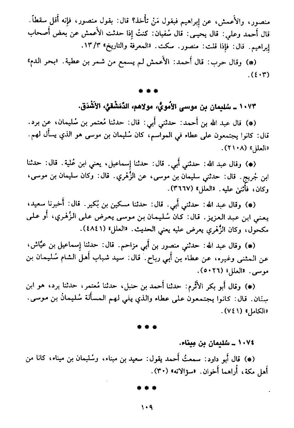 • وقال عبد الله: حدثنى أبي. قال: حدثنا إسماعيل، يعني ابن علية. قال: حدثنا ابن جريج. قال: حدثني سليمان بن موسى، عن الزهري. قال: وكان سليمان بن موسى، وكان، فأثنى عليه. «العلل» (3667) .