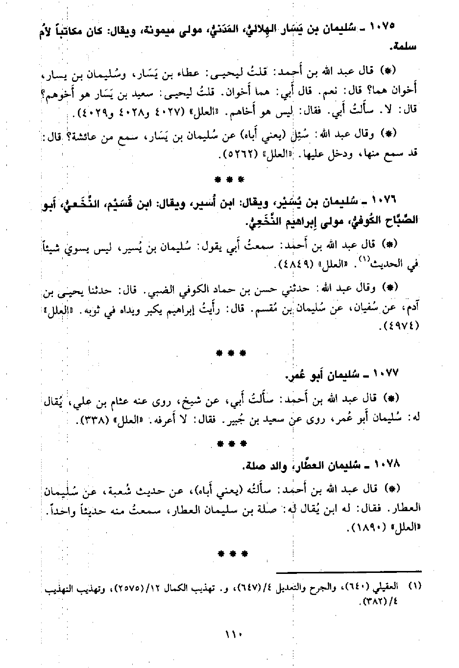 • قال عبد الله بن أحمد: سألت أبي، عن شيخ، روى عنه عثام بن علي، يقال له: سليمان أبو عمر، روى عن سعيد بن جبير. فقال: لا أعرفه. «العلل» (338) .
