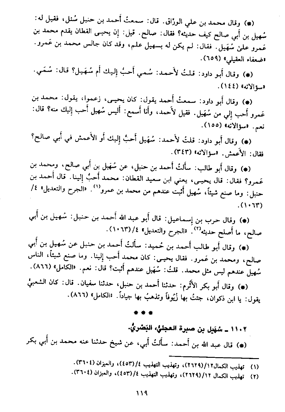 • وقال محمد بن علي الوراق. قال: سمعت أحمد بن حنبل سئل، فقيل له: سهيل بن أبي صالح كيف حديثه؟ فقال: صالح. قيل: إن يحيى القطان يقدم محمد بن عمرو على سهيل. فقال: لم يكن له بسهيل علم، وقد كان جالس محمد بن عمرو. «ضعفاء العقيلي» (659) .