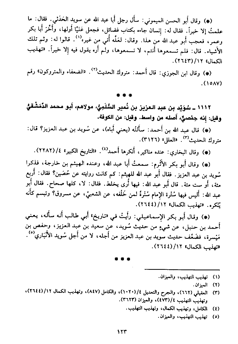 • وقال أبو الحسن الميموني: سأل رجل أبا عبد الله عن سويد الحدثي. فقال: ما علمت إلا خيراً. فقال له: إنسان جاءه بكتاب فضائل، فجعل علياً أولها، وأخر أبا بكر وعمر، فعجب أبو عبد الله من هذا. وقال: لعله أتي من غيره. قالوا له: وثم تلك الأشياء. قال: فلم تسمعوها أنتم، لا تسمعوها، ولم أره يقول فيه إلا خيراً. «تهذيب الكمال» 12/ (2643) .