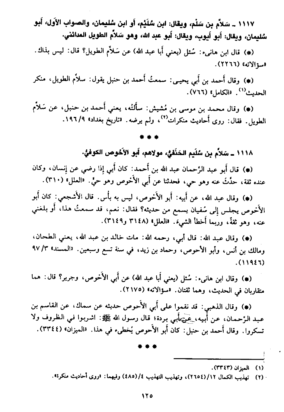 • وقال محمد بن موسى بن مشيش: سألته، يعني أحمد بن حنبل، عن سلام الطويل. فقال: روى أحاديث منكرات، ولم يرضه. «تاريخ بغداد» 9/196.