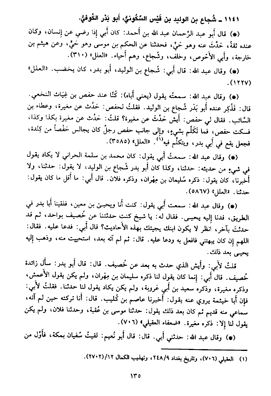 • وقال عبد الله: سَمِعتُهُ يقول (يعني أباه) : كنا عند حفص بن غياث النخعي. قال: فذكر عنده أبو بدر شجاع بن الوليد. فقلت: لحفص: حدث عن مغيرة، وعطاء بن السائب. فقال لي حفص: أيش حدث عن مغيرة؟ قلت: حدث عن مغيرة بكذا وكذا، فسكت حفص، فما تكلم بشي، وإلى جانب حفص رجل كان يجالس حفصاً من كندة، فجعل يقع فى أبي بدر، وتكلم فيه. «العلل» (3585) .