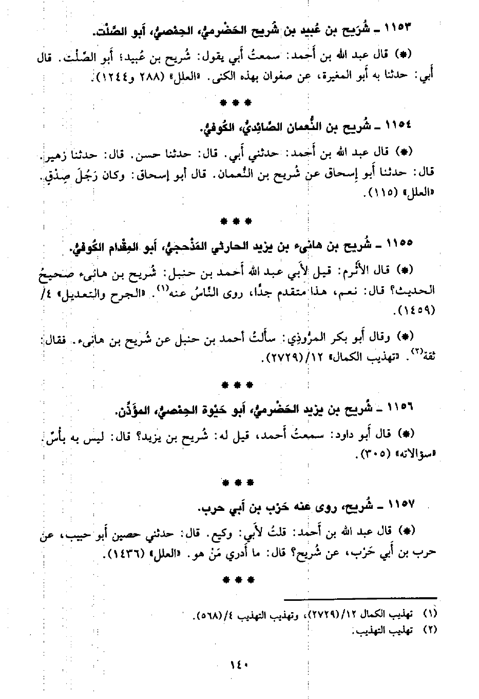 • قال الأثرم: قيل لأبي عبد الله أحمد بن حنبل: شريح بن هانىء صحيح الحديث؟ قال: نعم، هذا متقدم جداً، روى الناس عنه. «الجرح والتعديل» 4/ (1459) .