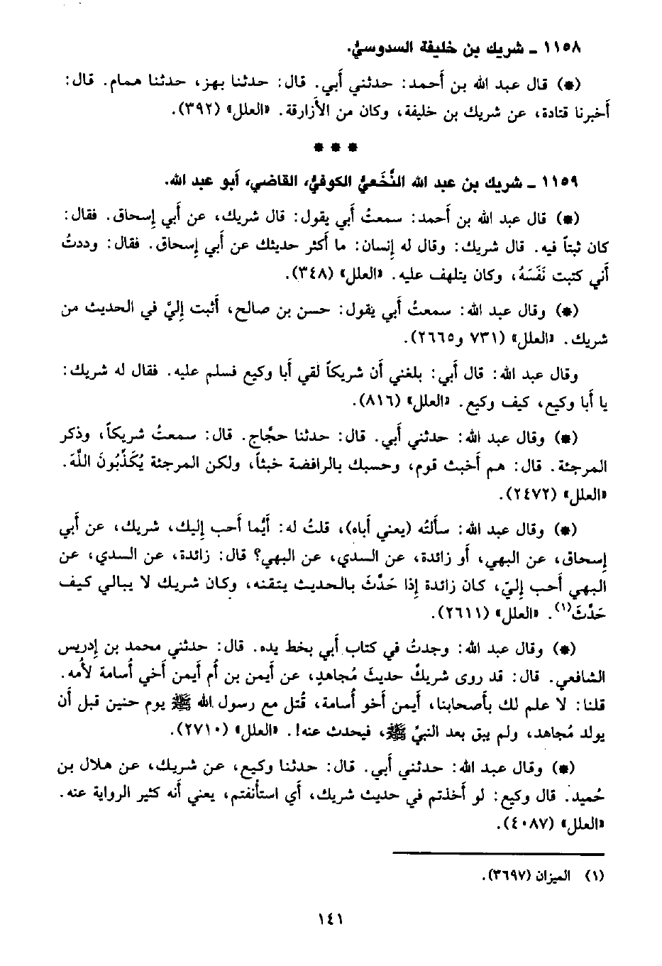 • وقال عبد الله: سمعتُ أَبي يقول: حسن بن صالح، أثبت إلي في الحديث من شريك. «العلل» (731 و2665) .