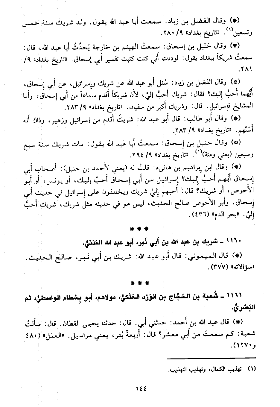 • وقال أبو طالب: قال أبو عبد الله: شريك أقدم من إسرائيل وزهير، وذاك أنه أسنهم. «تاريخ بغداد» 9/283.