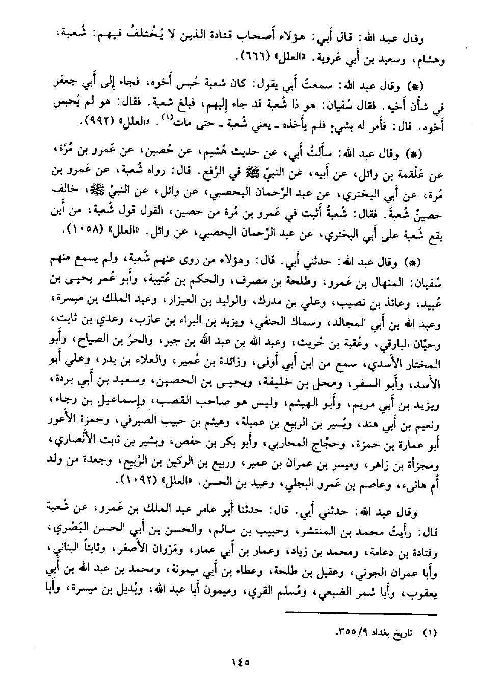 • وقال عبد الله: حدثني أبي. قال: وهؤلاء من روى عنه شعبة، ولم يسمع منهم سفيان: المنهال بن عمرو، وطلحة بن مصرف، والحكم بن عتيبة، وأبو عمر يحيى بن عبيد، وعائذ بن نصيب، وعلي بن مدرك، والوليد بن العيزار، وعبد الملك بن ميسرة، وعبد الله بن أبي المجالد، وسماك الحنفي، ويزيد بن البراء بن عازب، وعدي بن ثابت. وحيان البارقي، وعقبة بن حريث، وعبد الله بن عبد الله بن جبر، والحر بن الصياح، وأبو المختار الأسدي، سمع من ابن أبي أوفى، وزائدة بن عمير، والعلاء بن بدر، وعلي أبو الأسد، وأبو السفر، ومحل بن خليفة، ويحيى بن الحصين، وسعيد بن أبي بردة، ويزيد بن أبي مريم، وأبو الهيثم، وليس هو صاحب القصب، وإسماعيل بن رجاء، ونعيم ابن أبي هند، ويسير بن الربيع بن عميلة، وهيثم بن حبيب الصيرفي، وحمزة الأعور أبو عمارة بن حمزة، وحجاج المحاربي، وأبو بكر بن حفص، وبشير بن ثابت الأنصاري، ومجزأة بن زاهر، وميسر بن عمران بن عمير، وربيع بن الركين بن الربيع، وجعدة من ولد أم هانىء، وعاصم بن عمرو البجلي، وعبيد بن الحسن. «العلل» (1092) .