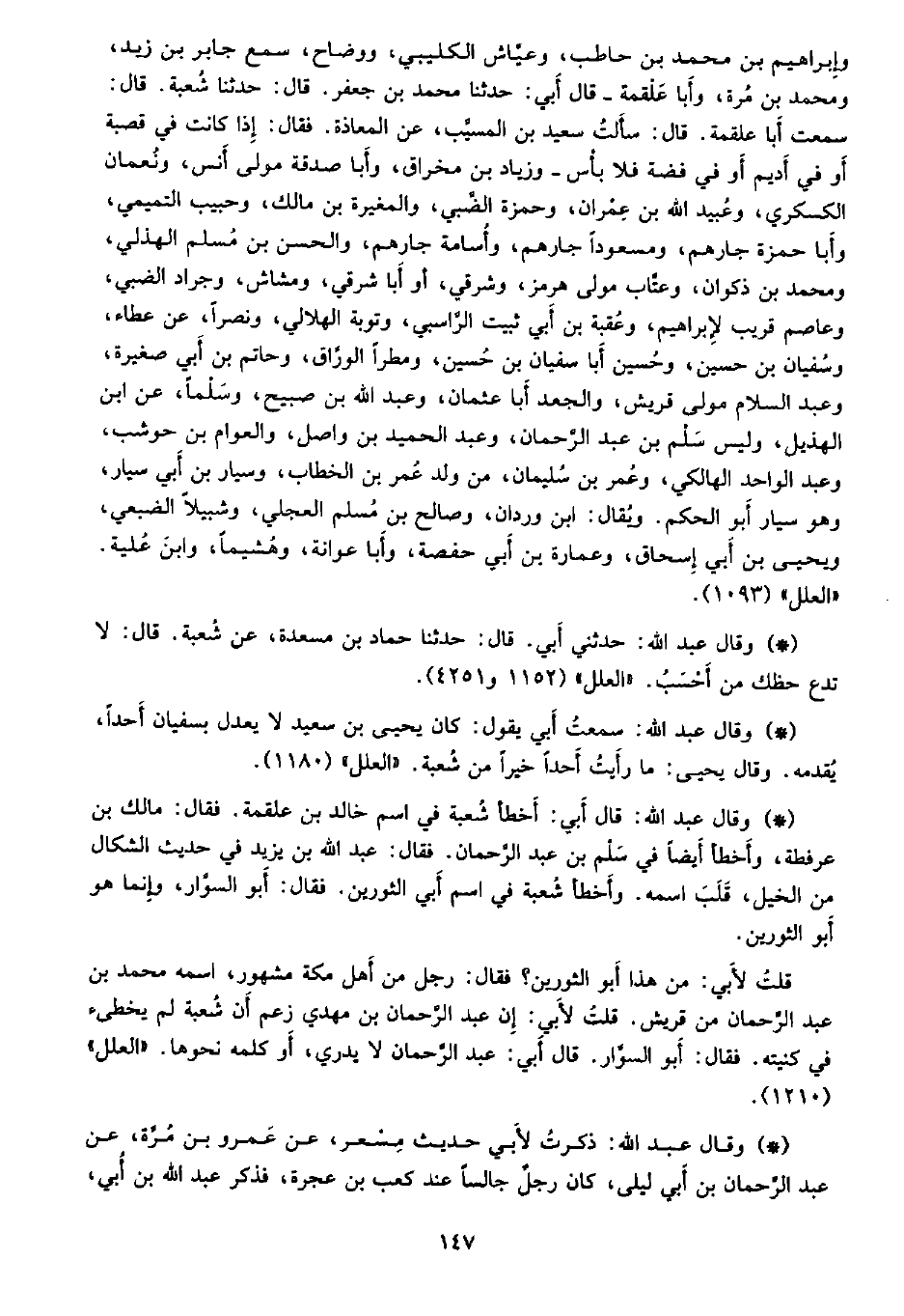• وقال عبد الله: قال أبي: أخطأ شعبة في اسم خالد بن علقمة. فقال: مالك بن عرفطة، وأخطأ أيضاً في سلم بن عبد الرحمن. فقال: عبد الله بن يزيد في حديث الشكال من الخيل، قلب اسمه. وأخطأ شعبة في اسم أبي الثورين. فقال: أبو السوار، وإنما هو أبو الثورين.