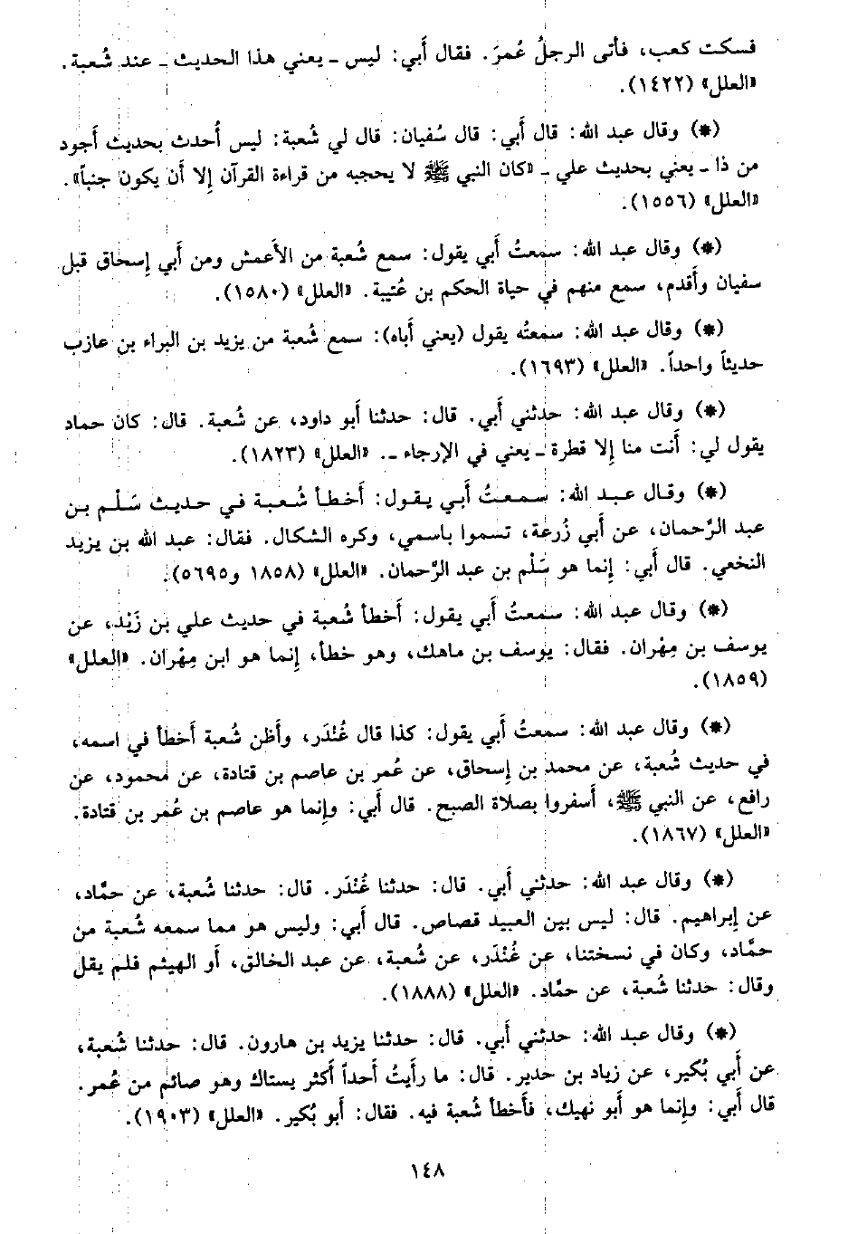 • وقال عبد الله: سمعتُ أَبي يقول: سمع شعبة من الأعمش ومن أبي إسحاق قبل سفيان وأقدم، سمع منهم في حياة الحكم بن عتبية. «العلل» (1580) .