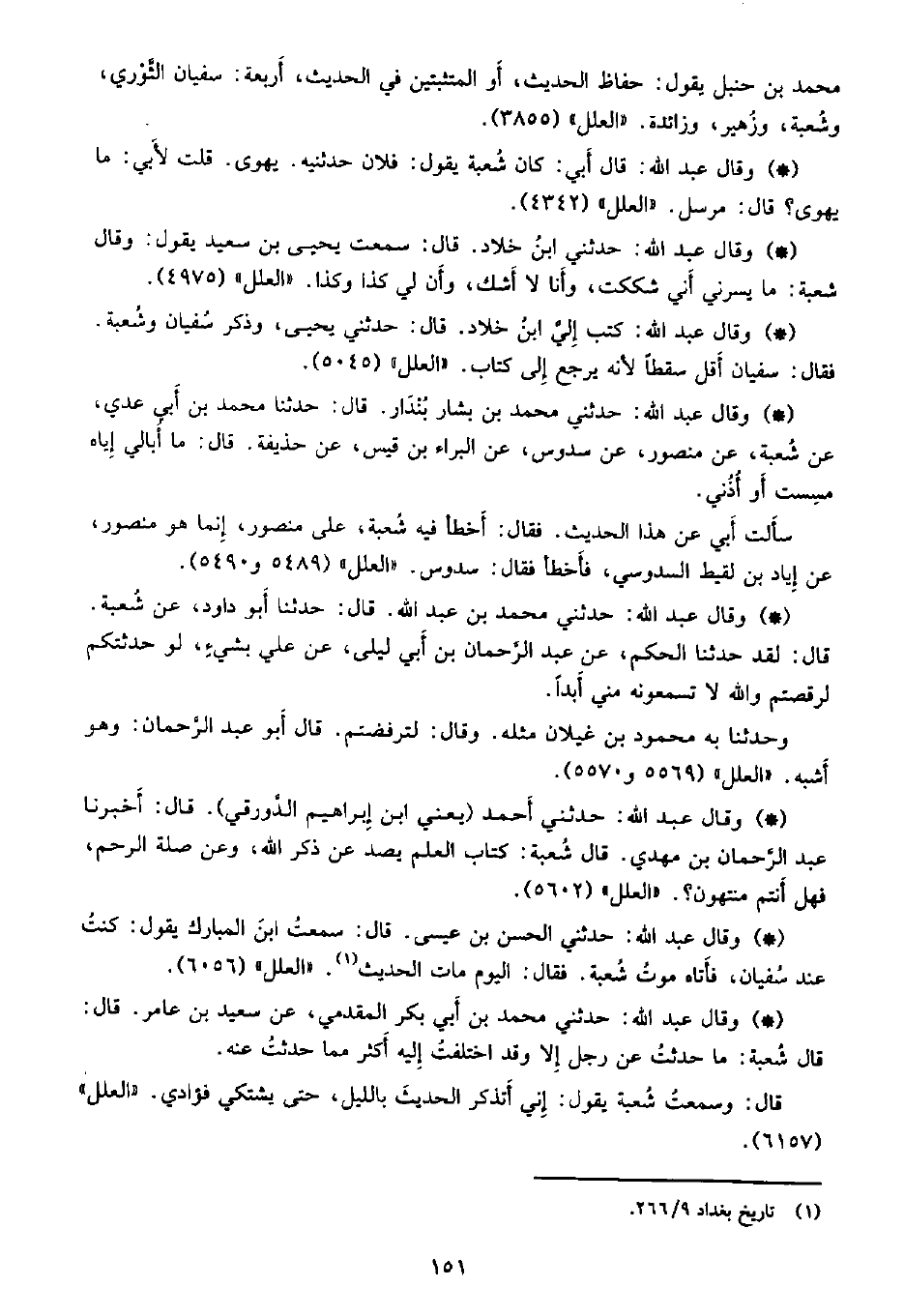 • وقال عبد الله: حدثني أحمد (يعني ابن إبراهيم الدورقي) . قال: أخبرنا عبد الرحمن بن مهدي. قال شعبة: كتاب العلم يصد عن ذكر الله، وعن صلة الرحم، فهل أنتم منتهون؟. «العلل» (5602) .