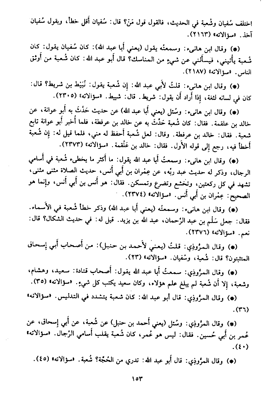 • وقال ابن هانىء: وسَمِعتُهُ يقول (يعني أبا عبد الله) : كان سفيان يقول: كان شعبة يأتيني، فيسألني عن شيء من المناسك؟ قال أبو عبد الله: كان شعبة من أوثق الناس. «سؤالاته» (2187) .
