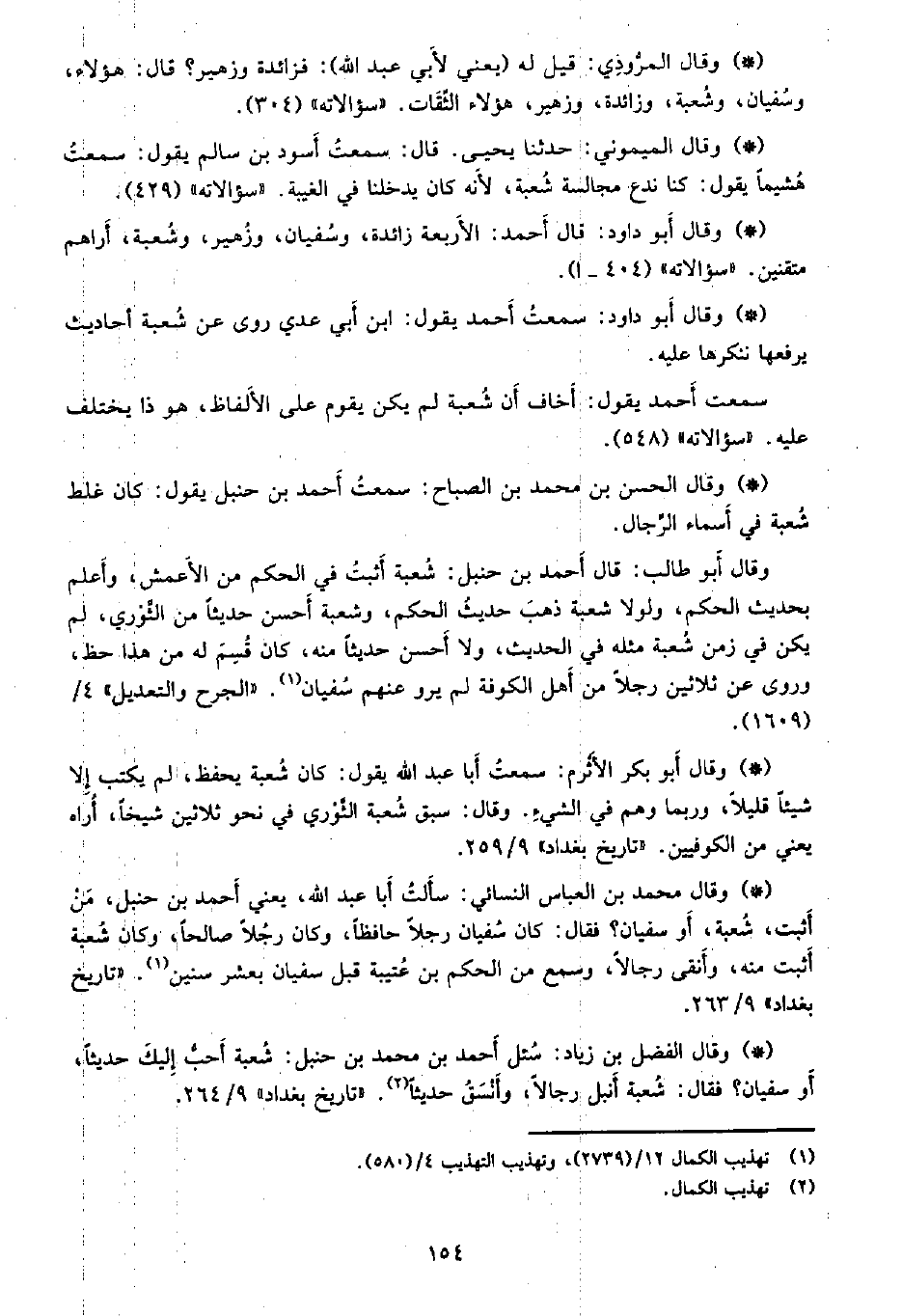 • وقال الفضل بن زياد: سئل أحمد بن محمد بن حنبل: شعبة أحب إليك حديثاً، أو سفيان؟ فقال: شعبة أنبل رجالا، وأنسق حديثاً. «تاريخ بغداد» 9/264.