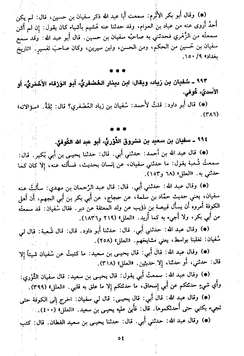 • وقال عبد الله: قال أبي: قال يحيى: قال لي سفيان: اخرج إلى الكوفة حتى تجيء بكتبي حتى أحدثكموها. قال: فأبى عليه يحيى بن سعيد. «العلل» (400) .