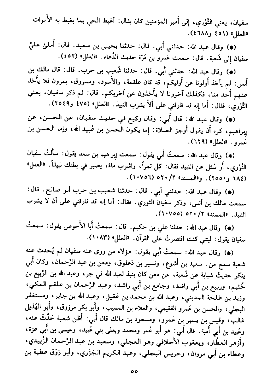 • وقال عبد الله: حدثني أبي. قال: حدثنا شعيب بن حرب أبو صالح. قال: سمعت مالك بن أنس، وذكر سفيان الثوري. فقال: أما إنه قد فارقني على أن لا يشرب النبيذ. «المسند» 2/520 (10755) .