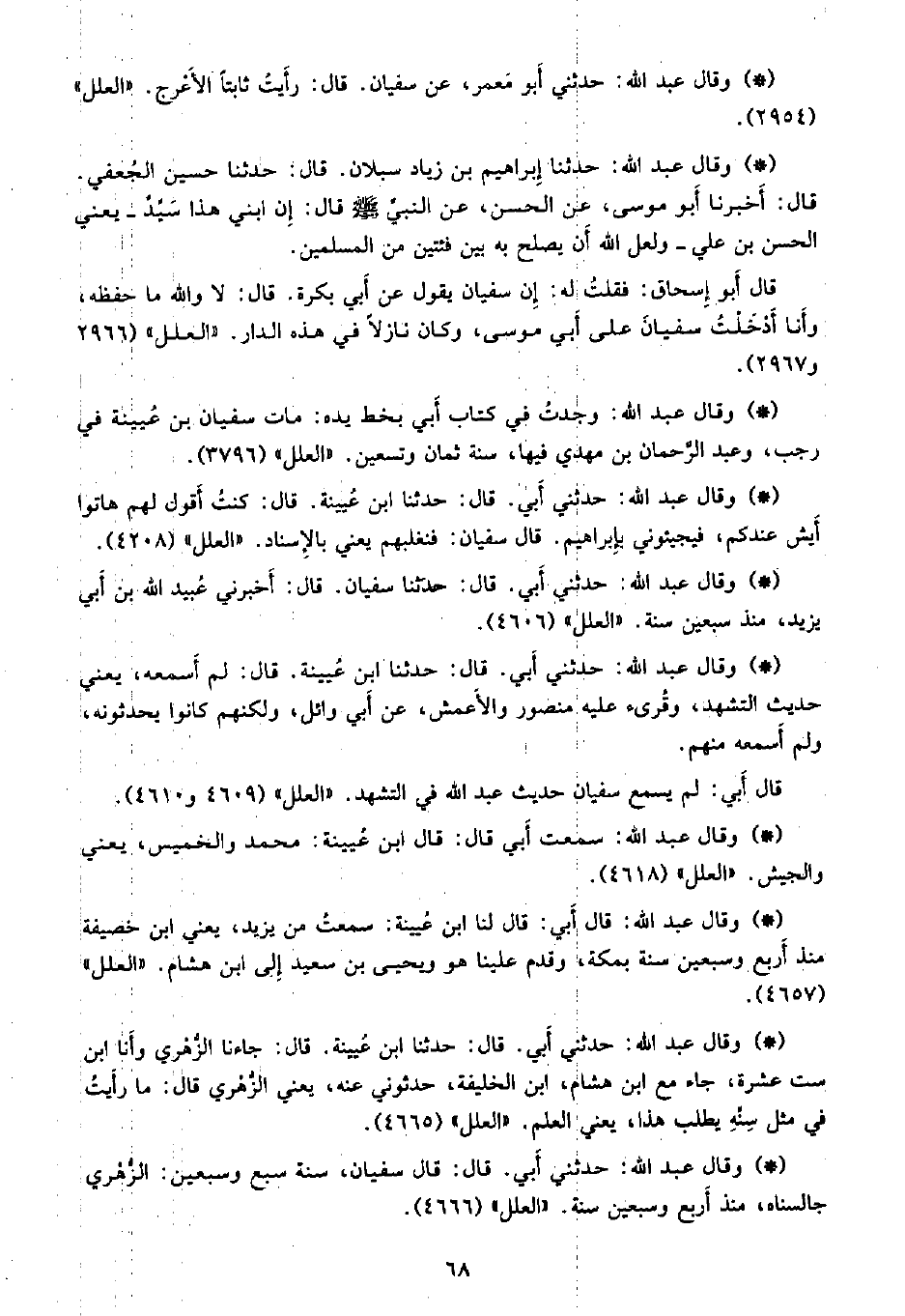 • وقال عبد الله: وجدت في كتاب أبي بخط يده: مات سفيان بن عيينة في رجب، وعبد الرحمن بن مهدي فيها، سنة ثمان وتسعين. «العلل» (3796) .