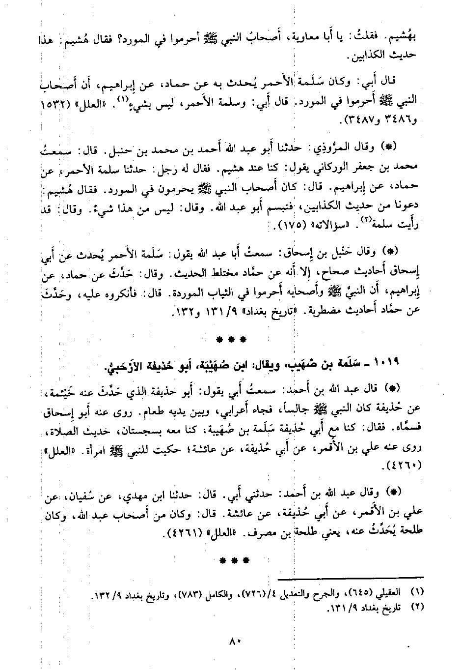 • وقال المروذي: حدثنا أبو عبد الله أحمد بن محمد بن حنبل. قال: سمعت محمد بن جعفر الوركاني يقول: كنا عند هشيم. فقال له رجل: حدثنا سلمة الأحمر، عن حماد، عن إبراهيم. قال: كان أصحاب النبي - صلى الله عليه وسلم - يحرمون في المورد. فقال هشيم: دعونا من حديث الكذابين، فتبسم أبو عبد الله. وقال: ليس من هذا شيء. وقال: قد رأيت سلمة. «سؤالاته» (175) .
