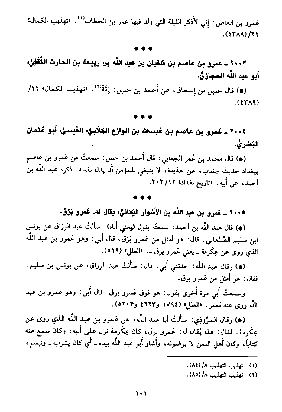 • قال محمد بن عمر الجعابي: قال أحمد بن حنبل: سمعت من عمرو بن عاصم ببغداد حديث جندب، عن حذيفة، لا ينبغي للمؤمن أن يذل نفسه، ذكره عبد الله بن أحمد، عن أبيه. «تاريخ بغداد» 12/202.