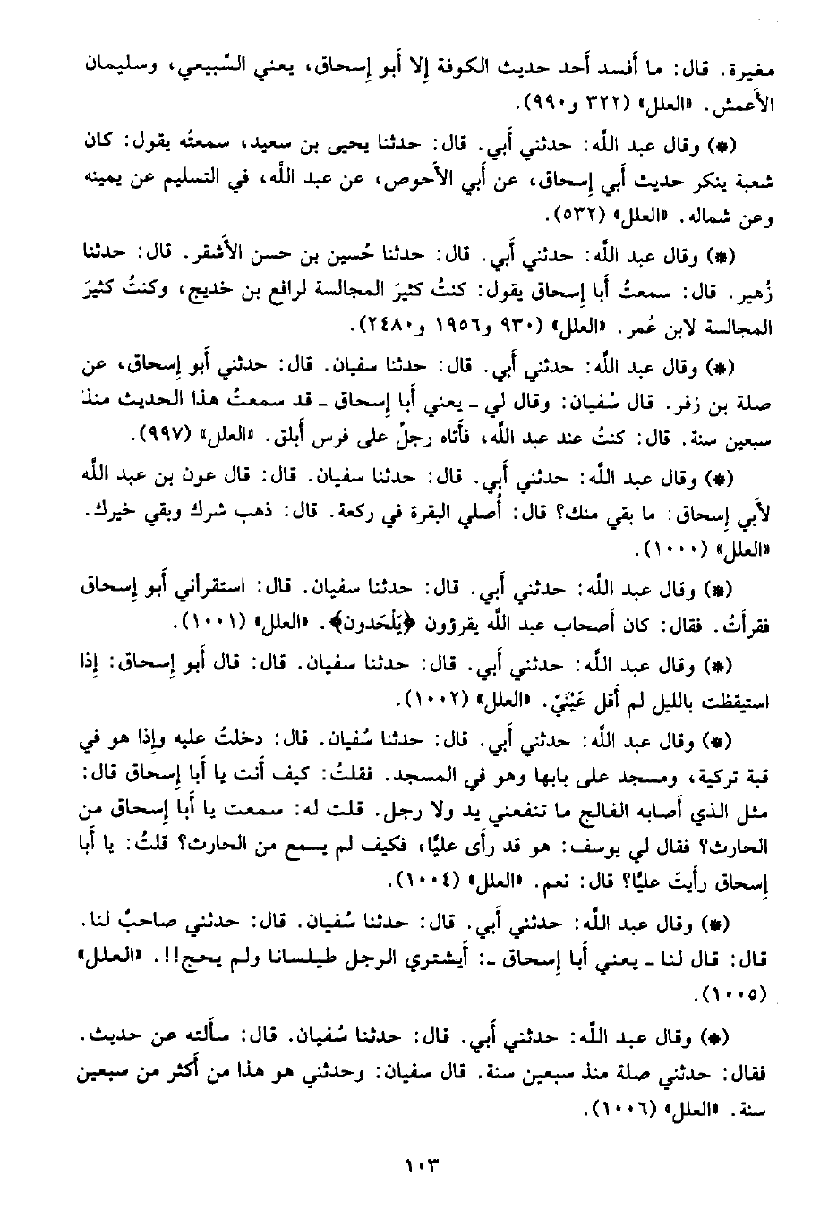 • وقال عبد الله: حدثني أبي. قال: حدثنا سفيان، قال: حدثني أبو إسحاق، عن صلة بن زفر، قال سفيان: وقال لي -يعني أبا إسحاق - قد سمعت هذا الحديث منذ سبعين سنة، قال: كنت عند عبد الله، فأتاه رجل على فرس أبلق. «العلل» (997) .