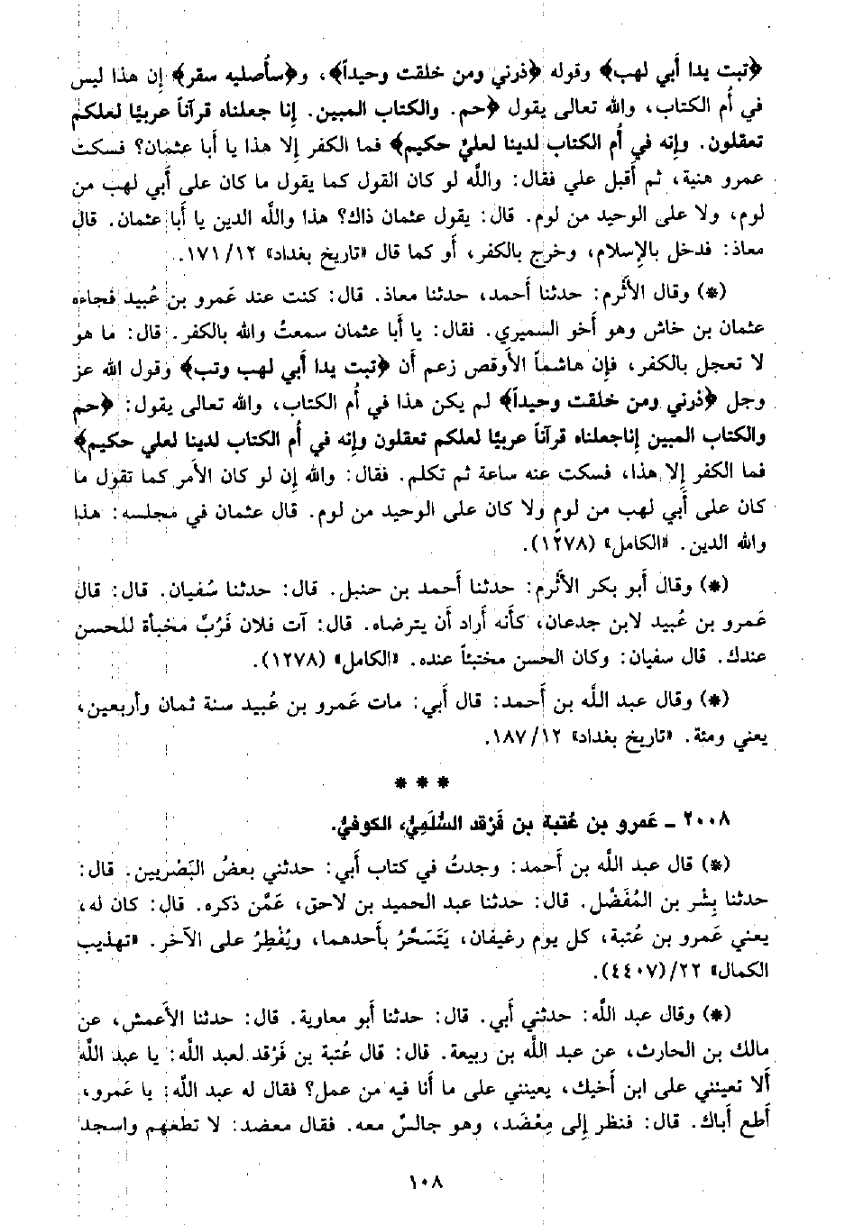 • وقال الأثرم: حدثنا أحمد، حدثنا معاذ، قال: كنت عند عمرو بن عبد فجاء، عثمان بن خاش وهو أخو السميري، فقال: يا ابا عثمان سمعت والله بالكفر، قال: ما هو لا تعجل بالكفر فإن هاشمًا الأوقص يقول: أن " تَبَّتْ يَدَا أَبِي لَهَبٍ " وقول الله عز وجل " ذَرْنِي وَمَنْ خَلَقْتُ وَحِيدًا " لم يكن هذا في أم الكتاب، والله تعالى يقول " حم. وَالْكِتَابِ الْمُبِينِ. إِنَّا جَعَلْنَاهُ قُرْآنًا عَرَبِيًّا لَعَلَّكُمْ تَعْقِلُونَ. وَإِنَّهُ فِي أُمِّ الْكِتَابِ لَدَيْنَا لَعَلِيٌّ حَكِيمٌ " فما الكفر إلا هذا، فسكت عنه ساعة ثم تكلم، فقال: إن والله لو كان القول كما يقول ما كان على أبي لهب من لوم، ولا كان على الوحيد من لوم، قال عثمان فى مجلسه: هذا والله الدين. «الكامل» (1278) .