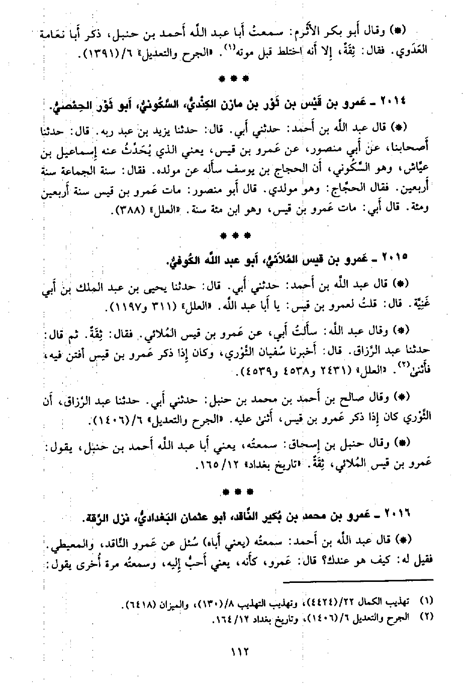 • وقال حنبل بن إسحاق: سَمِعتُهُ، يعني أبا عبد الله أحمد بن حنبل، يقول: عمرو بن قيس الملائي، ثقة. «تاريخ بغداد» 12/165.